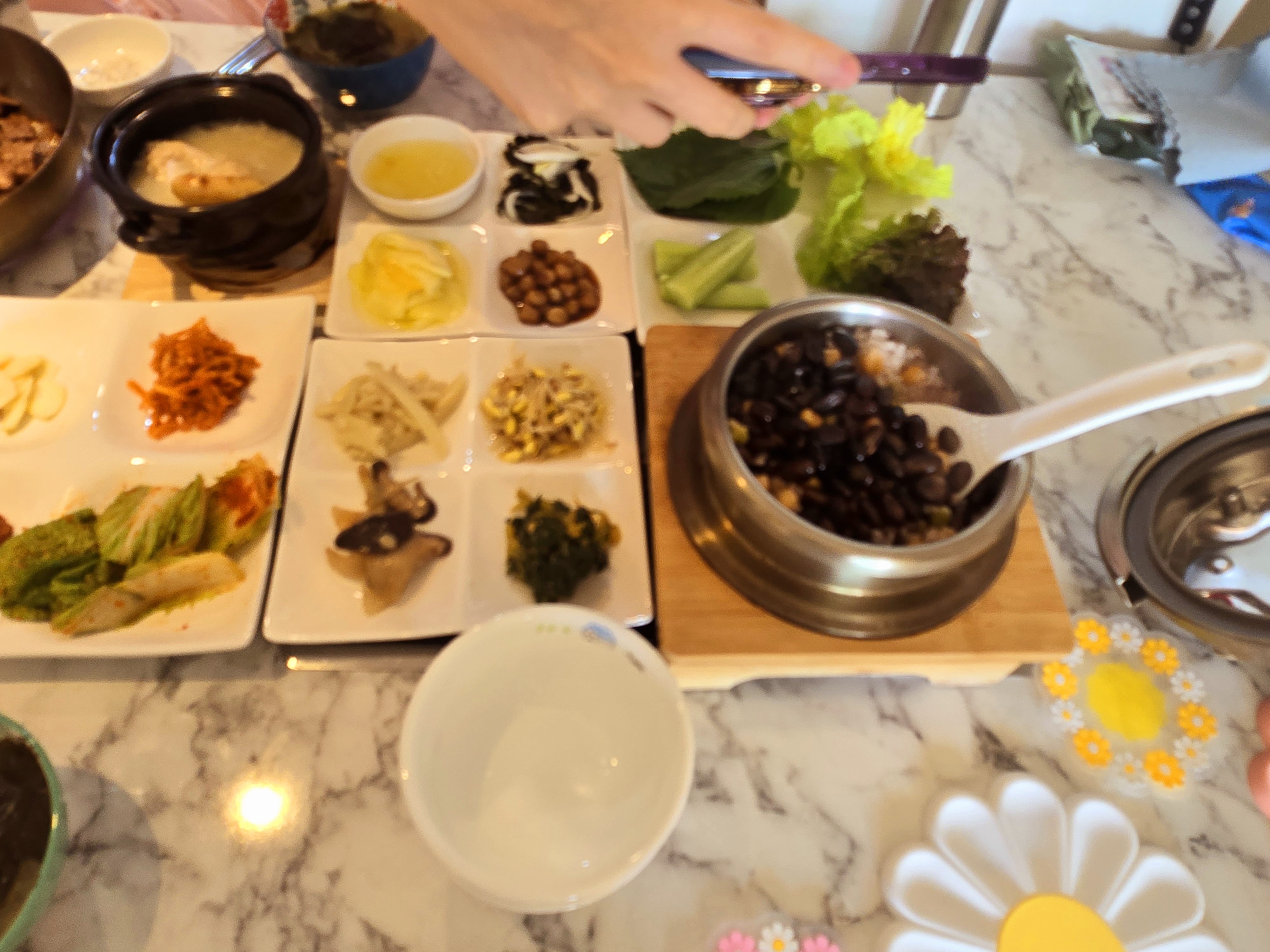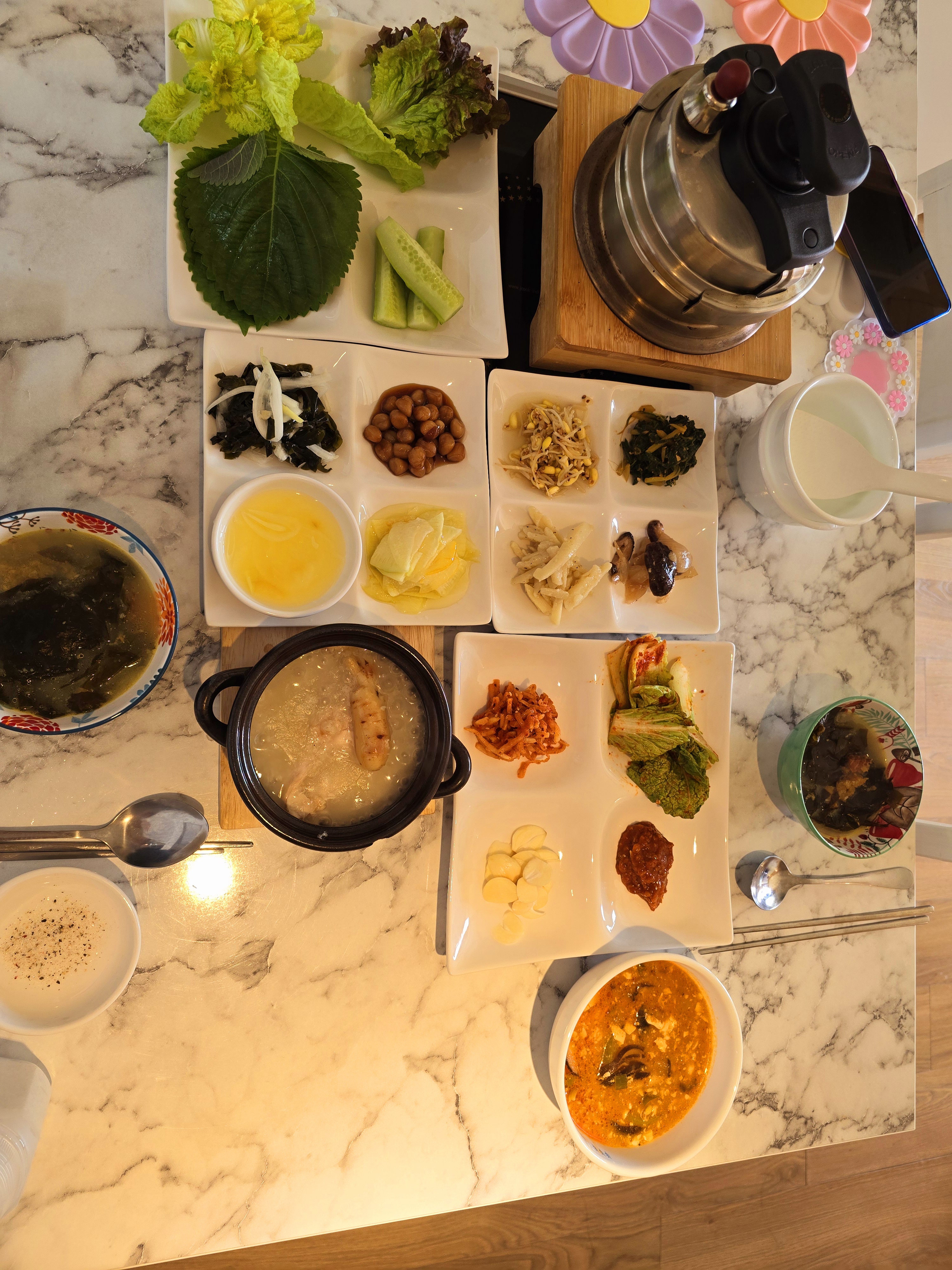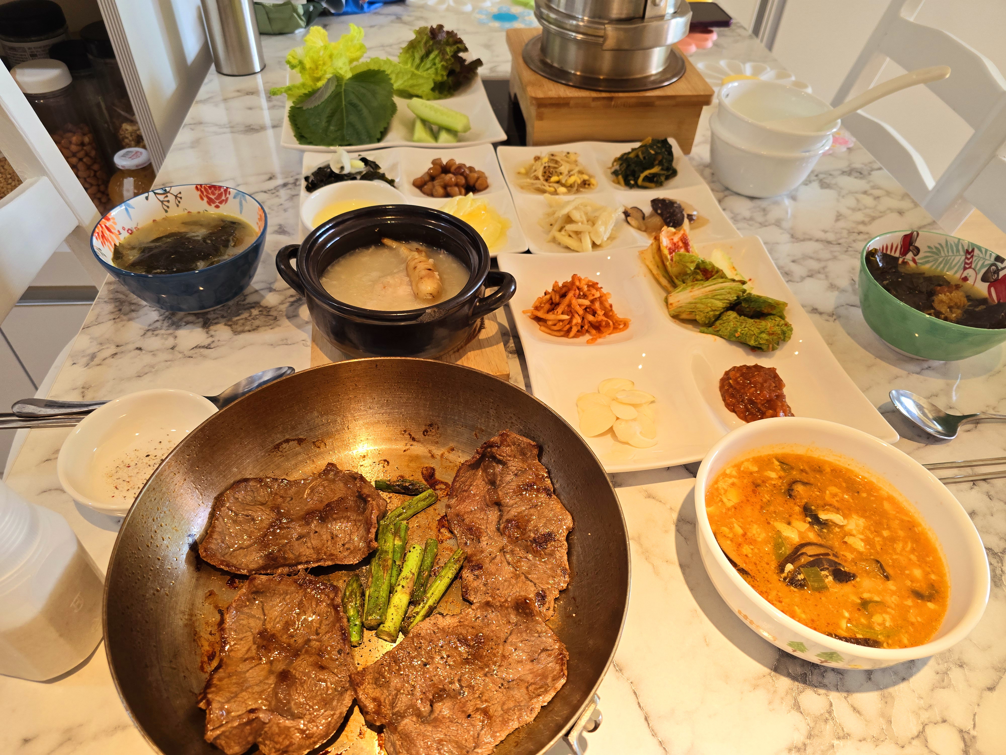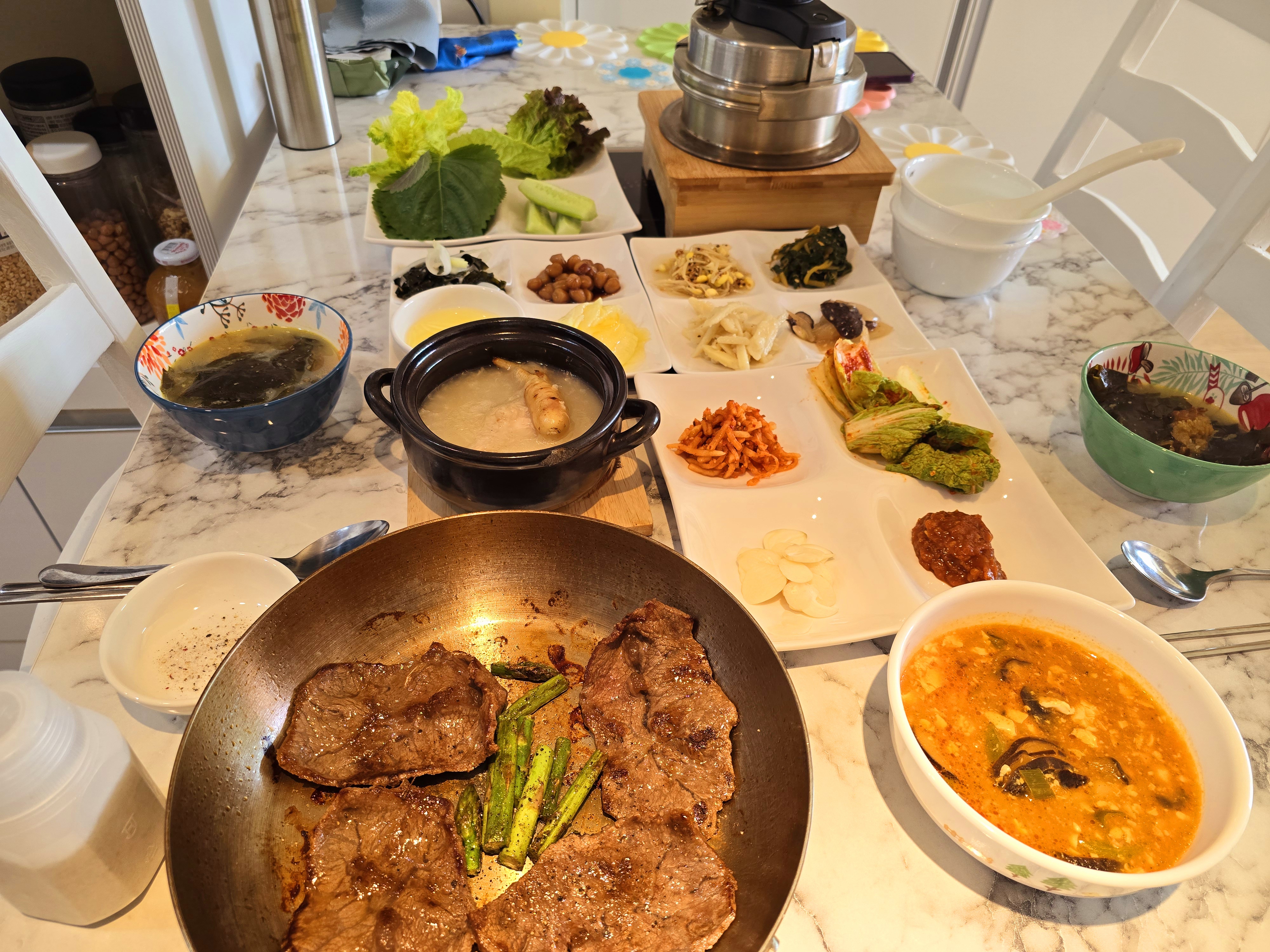 오늘 소개는 간단한 북어미역국 레시피와 콩솥밥이예요~ 여기에 기력을 보충할 부채살 소고기 구이와 인삼 넣은 백숙을 뽀글뽀글 끓여서 한상차림 했네요~그럼 집방 한상차림 사진으로 함께 보실게요~🥰