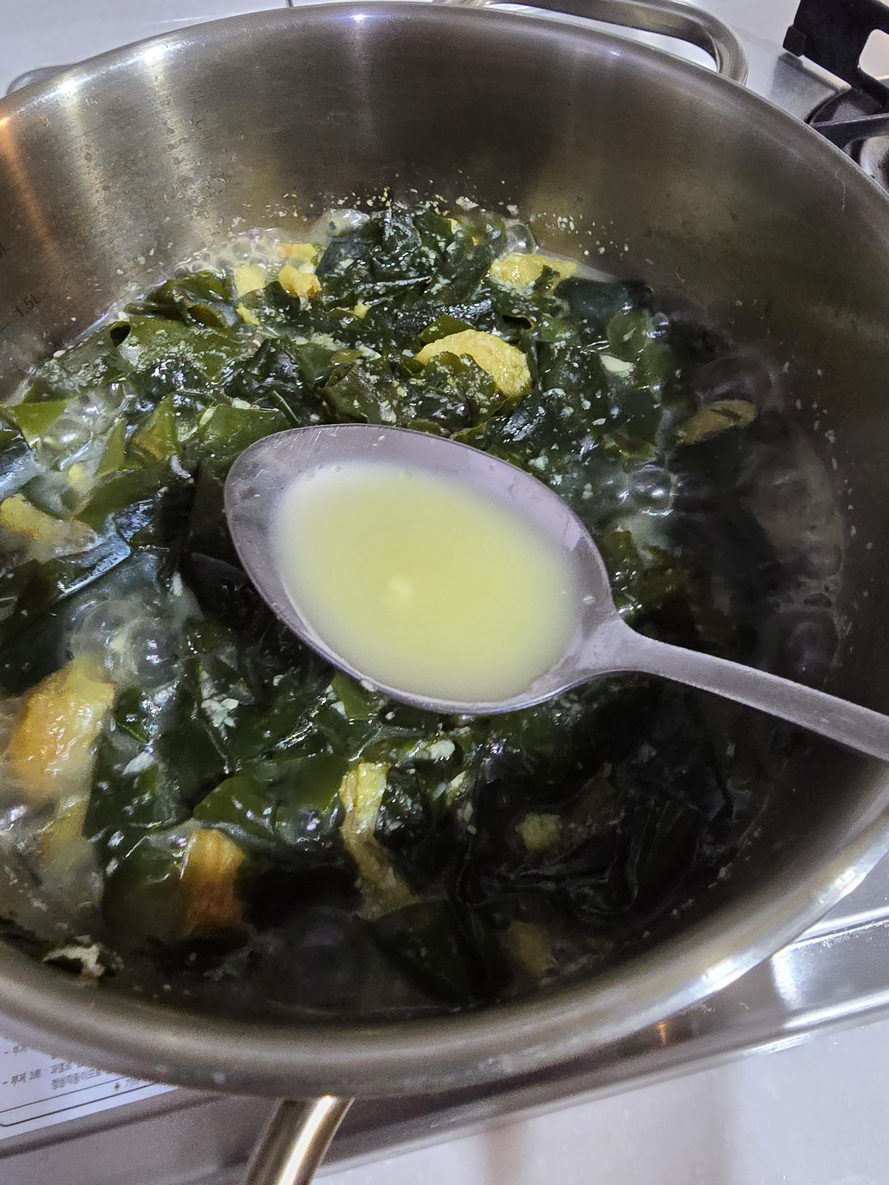 10분간 끓여주면 이렇게 진한 국물이 우러나와요~여기서 나머지 육수물을 넣고 10분간 더 끓여주면 완성이예요~* 드시기전 모자라는 간은 맛소금 또는 천일염으로 맟추시면 맛있는 북어 미역국 완성이예요 ~🤭
