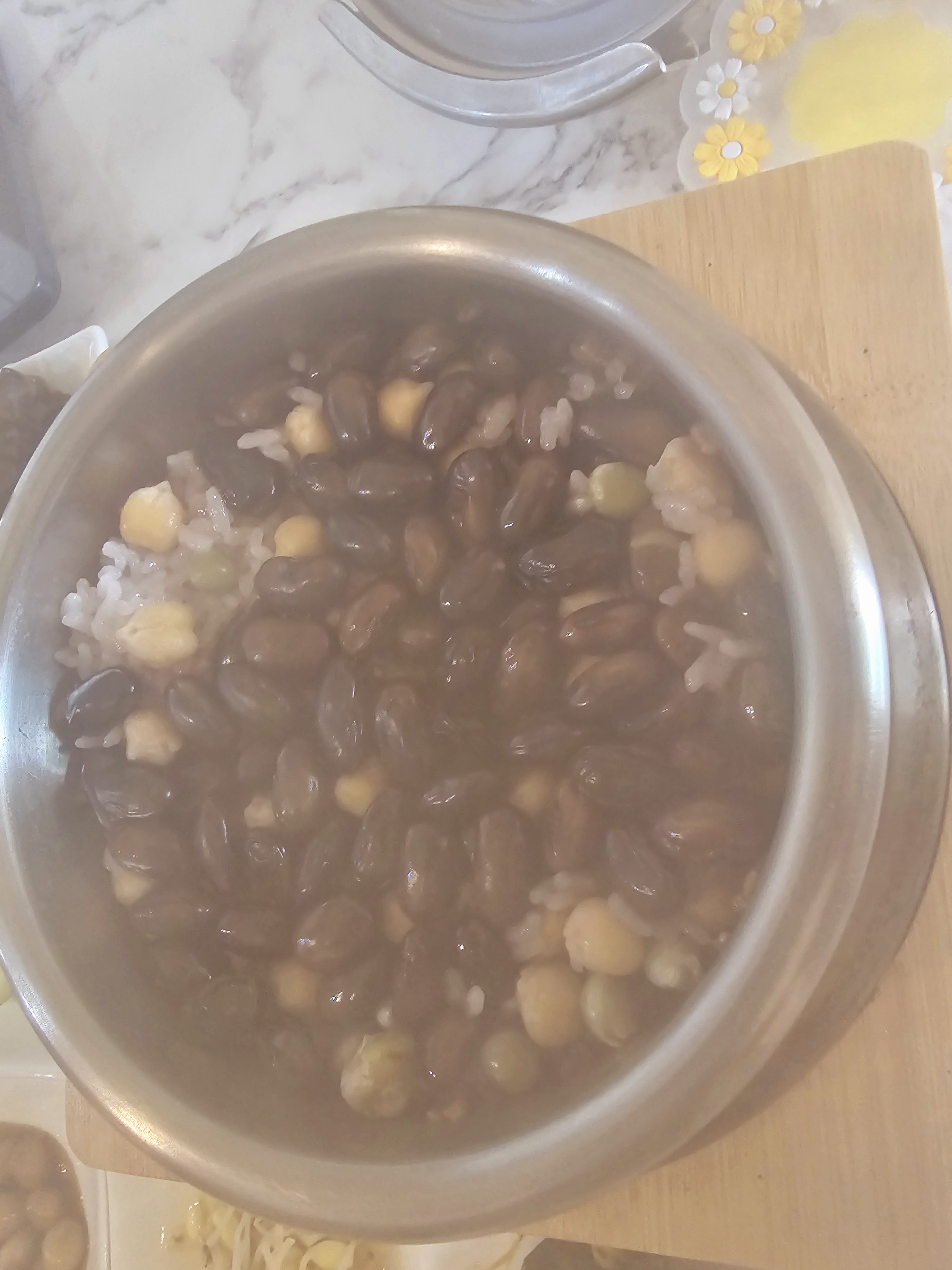 완두콩 병아리콩 서리태콩을 물에 불린 뒤 솥밭을 지을때 깨끗이 싯어서 불린 서리태 검정 콩물은 그대로 밥 물을 맞춰 솥밥을 지어보아요