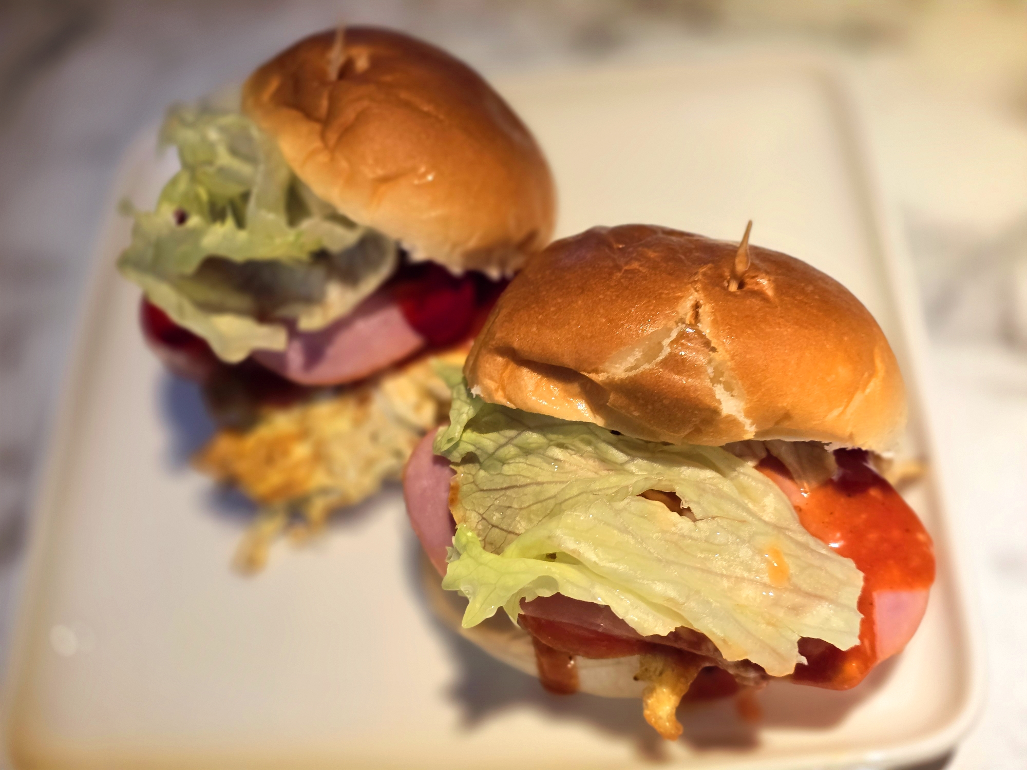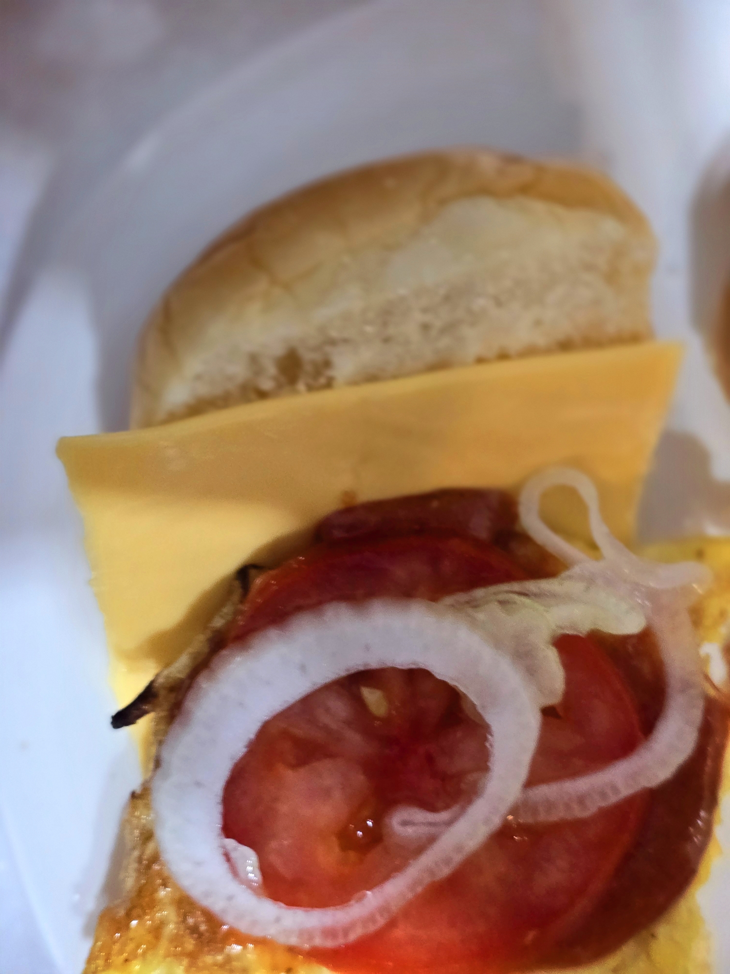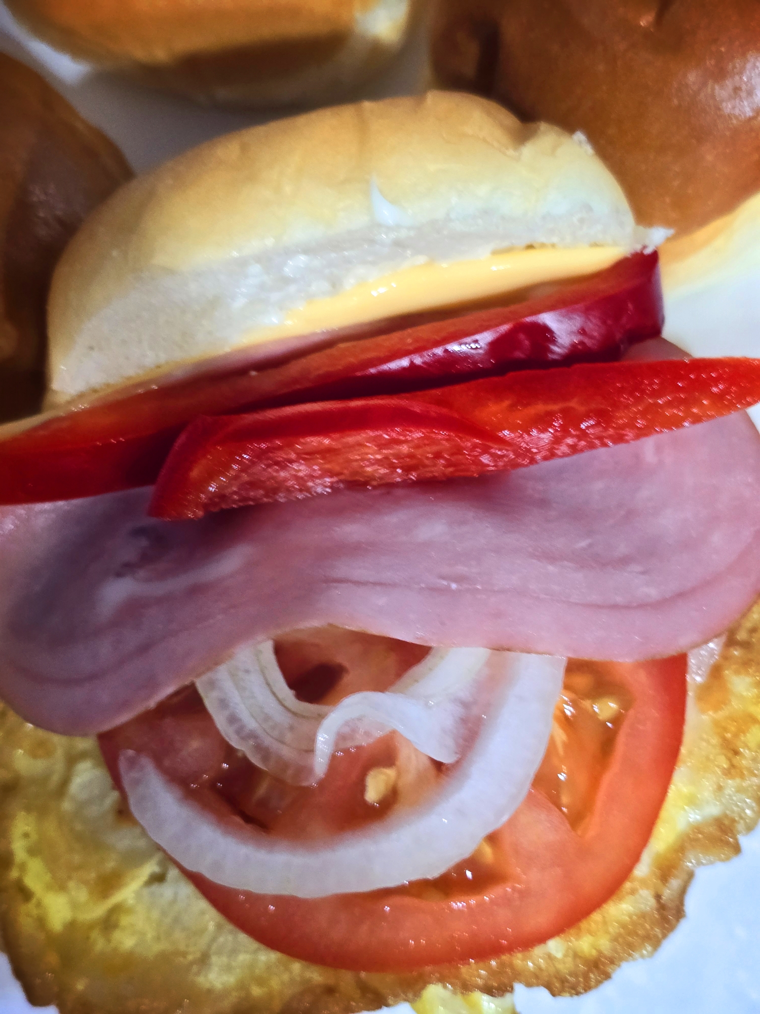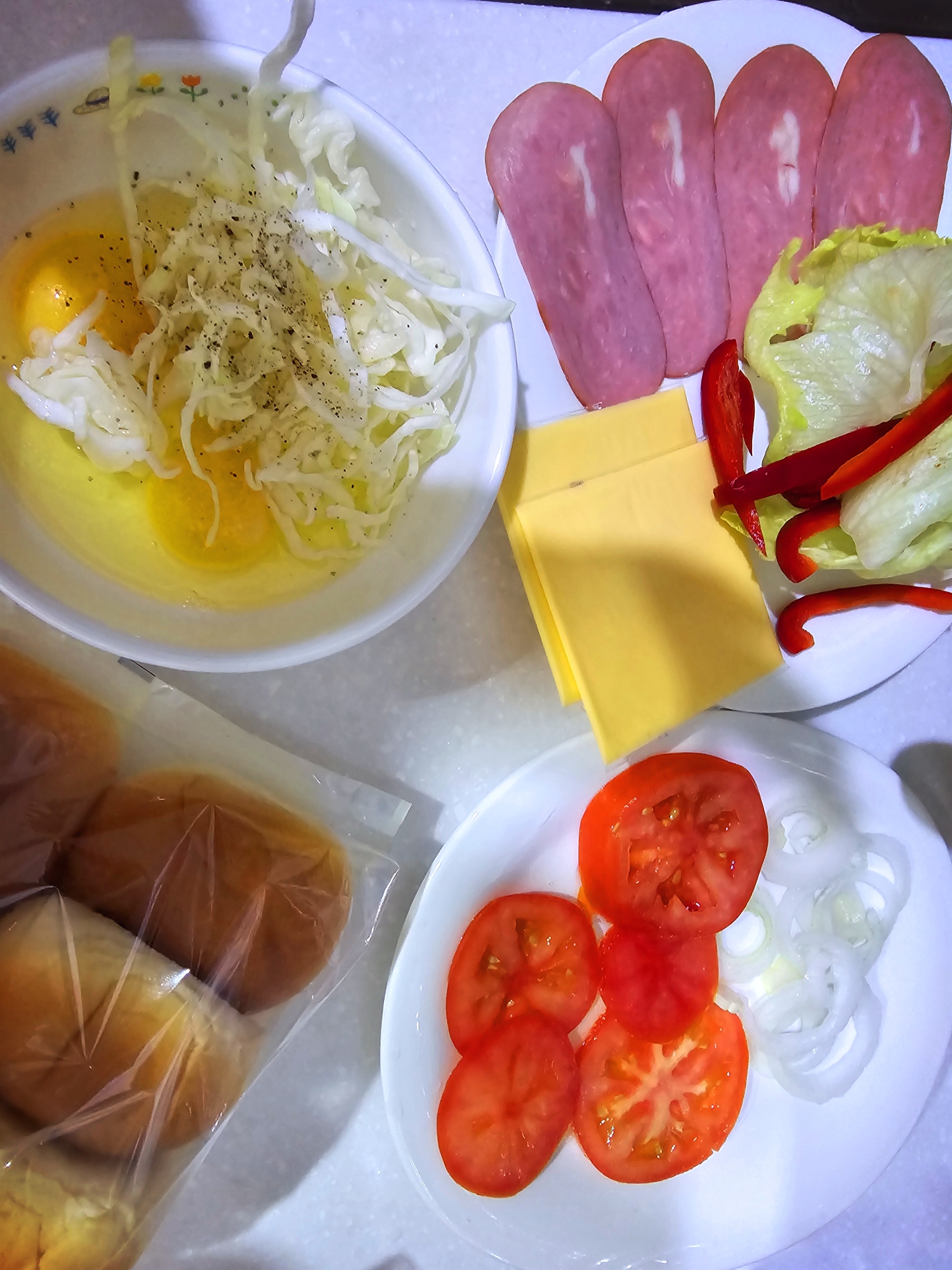 모닝빵 햄 치즈 계란 양배추 양파 파프리카 토마토 양상추 마요네즈